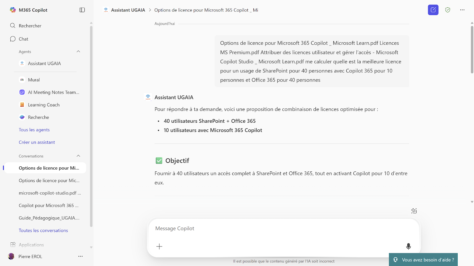 Le prompt : me calculer quelle est la meilleure licence pour un usage de SharePoint pour 40 personnes avec Copilot 365 pour 10 personnes et Office 365 pour 40 personnes.